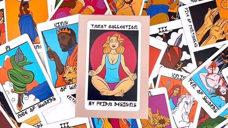 Custom made 78 Tarot Deck designed by Frida Designs comes with guide booklet.